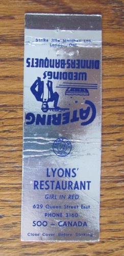CANADIAN TAX STAMP MATCHBOOK COVER: LYONS RESTAURANT SAULT STE. MARIE, ONTARIO B
