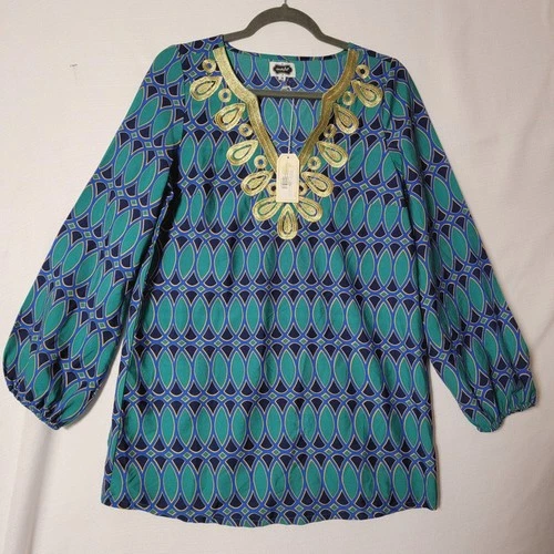 Mud Pie Tunic Top Womens Sz M 3/4 Puff Sleeves Corinne Green Blue & Gold NWT
