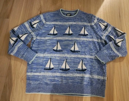Lands' End Women's Cotton Drifter Crew Neck Sweater XL Blue Sailboats Euc