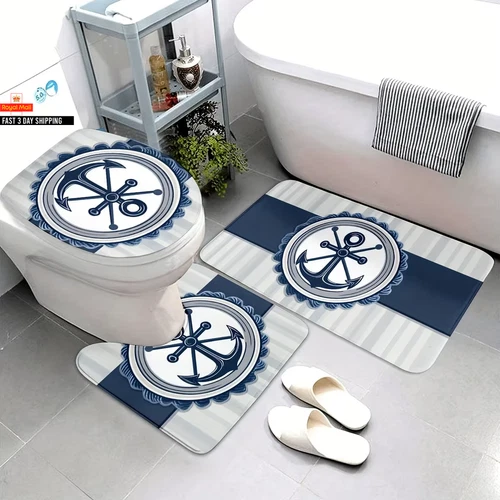 3-Piece Anchor Pattern Bath Mat Set, Machine Washable, Non-Slip Rubber Backed Ba
