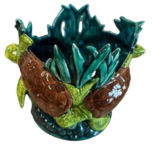Sea Turtle Planter Majolica Style Oahu Hawaii Signed Leihulie Ceramic