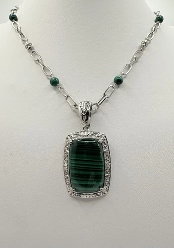 African Malachite Pendant Necklace Bead Station Paperclip Chain 18-20 in D’Joy