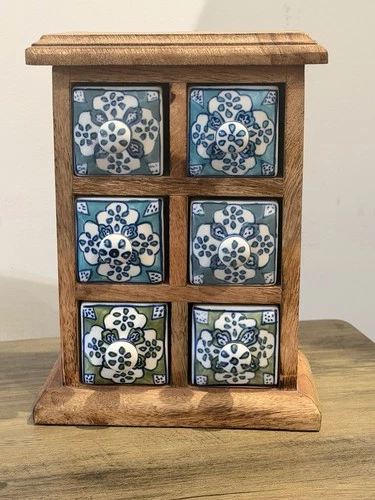 Hand Painted Ceramic 6 Drawer Chest Mango Wood Storage Cabinet Boho Rustic