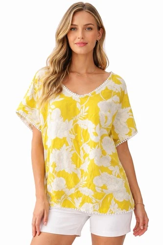 Marc New York Women’s Linen Blend Blouse L Yellow Floral Dolman Sleeve Boho