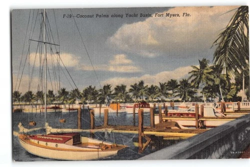 Postcard Fort Myers Florida Yacht Basin Coconut Palms Boats Marina