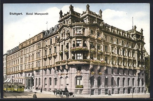 Stuttgart, postcard, Hotel Marquardt with street section 1911