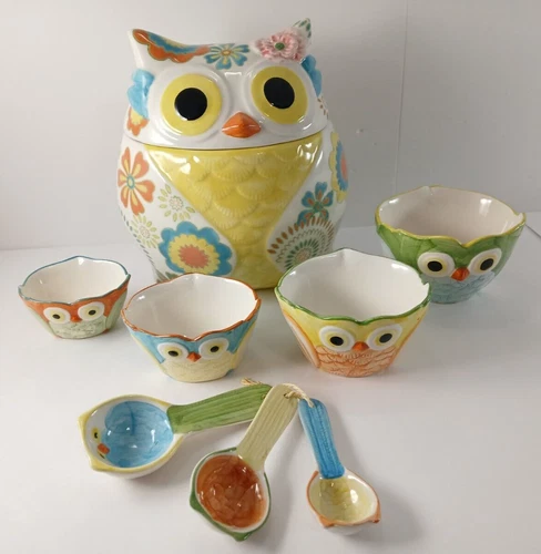 Pier 1 Imports COLORFUL OWL Cookie Jar + Measuring Cups & Spoons Stoneware Set!