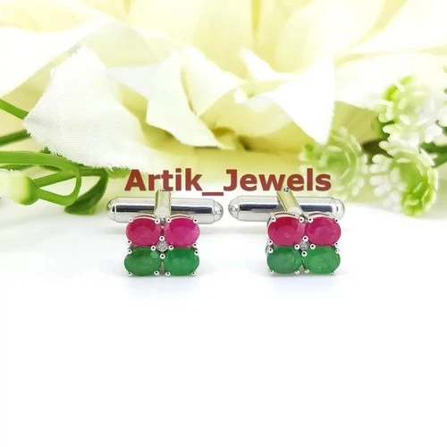Lab Grown Emerald & Heated Ruby Gemstone with 925 Sterling Silver Cufflink #2148