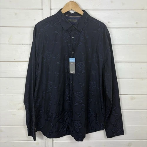 M&S Shirt Mens Size XL Navy Blue Floral Cotton Mix Occasion Party Evening NEW