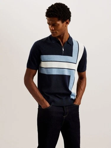 Ted Baker Mens Sweater Merino Wool Button Short Sleeve Color Block Blue 3 Medium