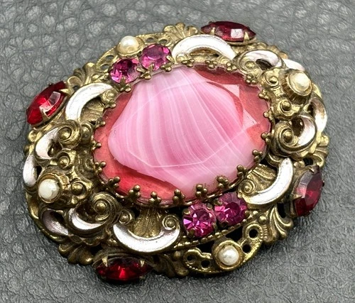 Vintage Pink West Germany Marbled Porphyry Glass Cabochon Rhinestone Brooch