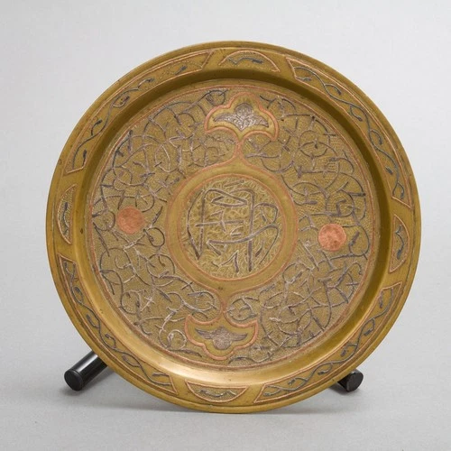 Antique Middle Eastern Islamic Persian Damascene Mixed Metal Plate Tray 9.75"
