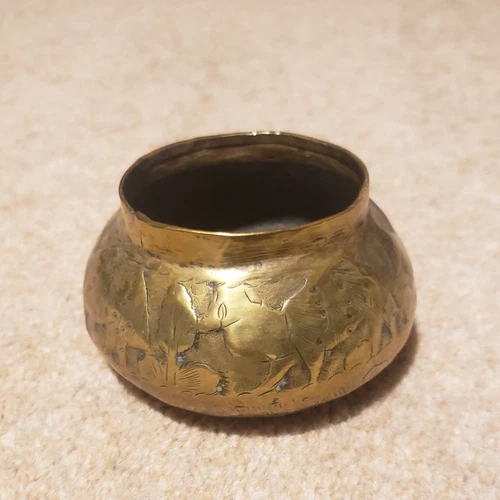 Small Brass Bowl Pot Middle Eastern Handmade Animal Pattern Hammered Etched