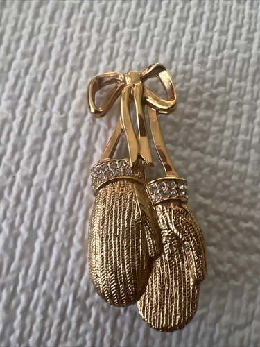 Vintage Mittens Pin Brooch Bow Gloves Gold Tone Antiqued Brushed