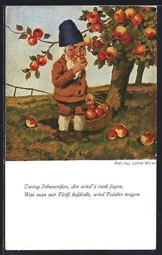 Artist postcard Paul Lothar Müller: dwarf harvesting apple