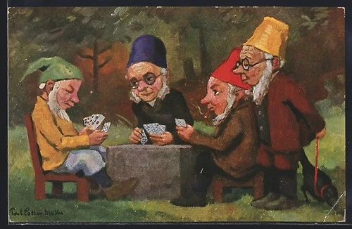 Artist postcard Paul Lothar Müller: Dwarves at the card game 1934
