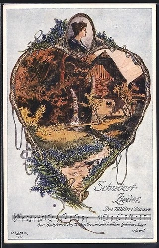 artist postcard signed O. Elsner: Schubert songs, Des Müller's flowers, building view