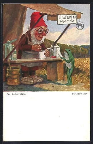 Artist postcard Paul Lothar Müller: apothecary dwarf sold to a frog