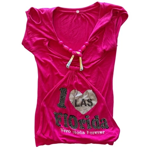 Y2K Vintage Vero Moda Hot Pink I Heart Florida Rhinstone Beaded Top Neck Large