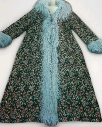 1960s 70s Bohemian Afghan Mongolian Fur Trim Penny Lane Tapestry Coat 16/18