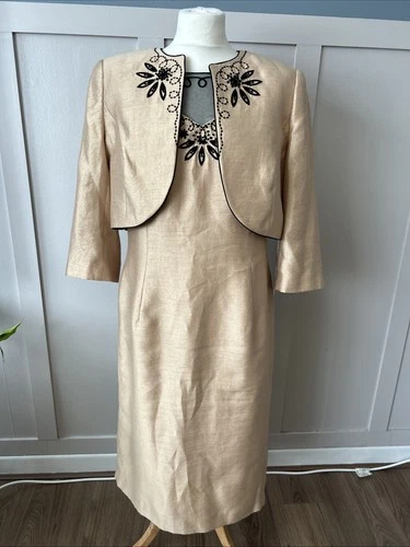 Jacques Vert Mother of the Bride Dress Jacket Suit Size 14 Gold & Black Beaded