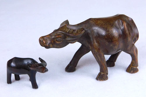 Vintage Wooden Hand Carved Water Buffalo Mother & Baby Set Figurines Animals