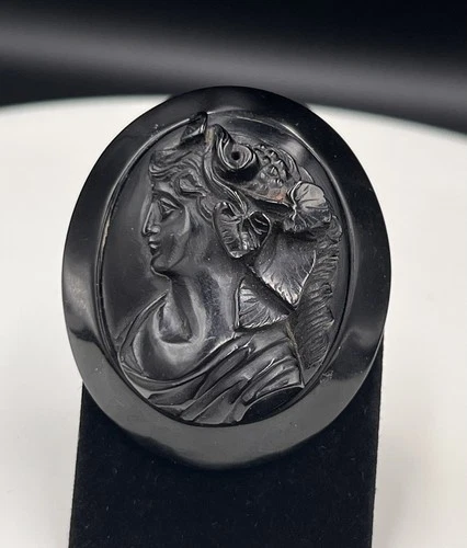 Vtg Victorian Whitby Jet Bacchante Cameo Brooch, Mourning Jewelry High Relief 2"