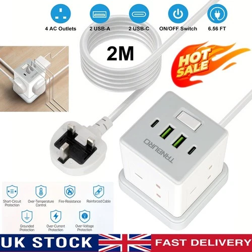 2M Extension 4 Way Tower Power Lead 4 USB Multi Socket Indicator Surge Protected