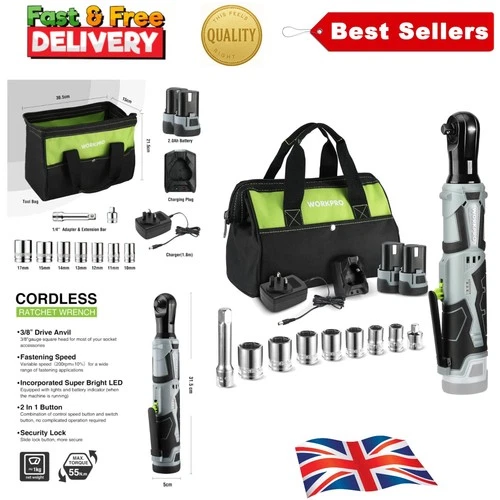 Efficient 3/8" Cordless Ratchet Wrench with 7 Sockets, LED Light & 55 N.m Torque
