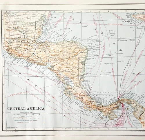 1914 Central America Map Collectible Antique Maritime Ship Routes Ephemera