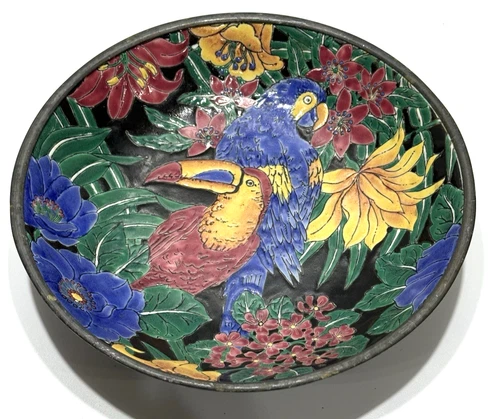 Neiman Marcus Colorful Exotic Toucan Parrots Bird Porcelain Bowl Enamel Pewter