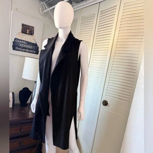 Neiman Marcus Black Sleeveless Long Open Front Vest outwear belted – Size L