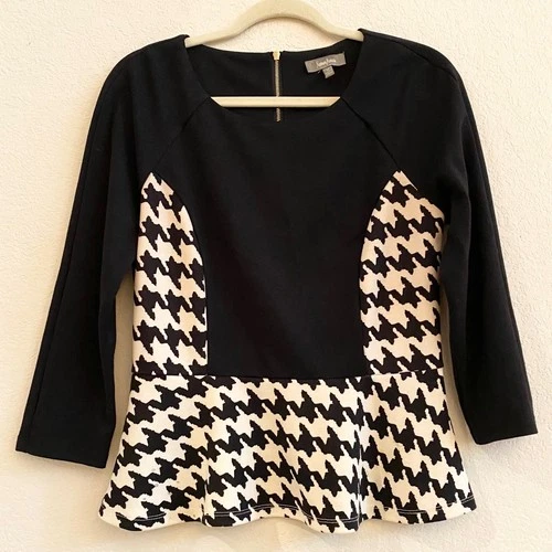 Neiman Marcus Houndstooth Peplum Top Black White Long Sleeve Zipper Womens M