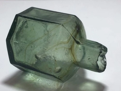 Nice LIGHT GREEN Octagonal Shear Lip Ink Bottle with AMBER SWIRLS/STREAKS