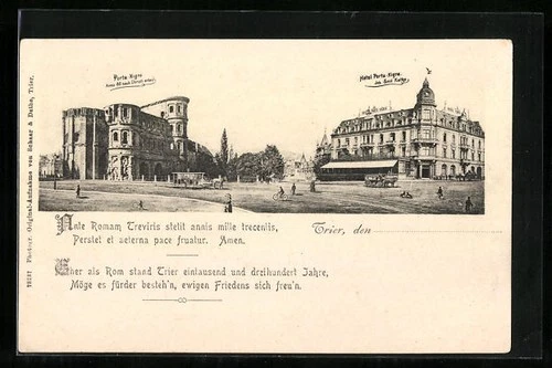 Postcard Trier, Porta Nigra and Hotel Porta Nigra Emil Kathe with street