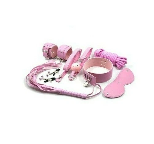 Top bondage kit set pink bite gag ball handcuffs nipple clamps rope collar