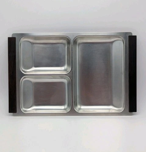 Vintage Danish Nord Stainless Steel 3 section Serving Platter Teak Handles-Label