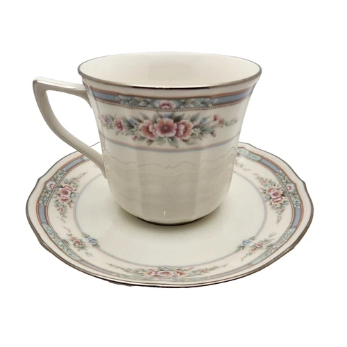Noritake Ivory teacup saucer Japan Rothschild pattern floral blue pink Coffee