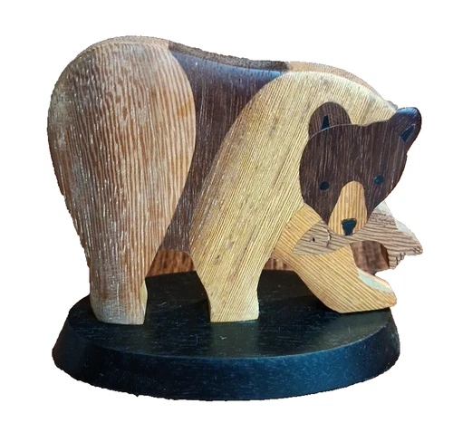 Northwoods Handmade Wooden Marquetry Bear with Fish Wood Sculpture Figurine