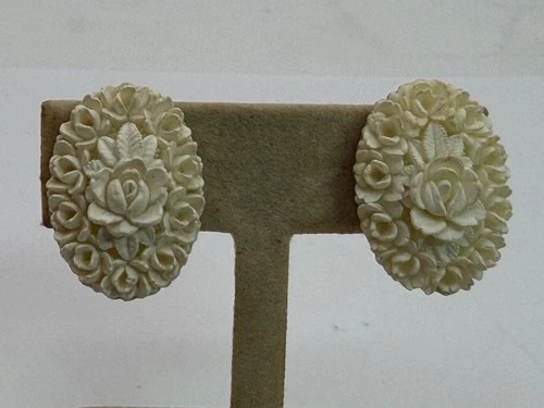 FEATHERLIGHT CELLULOID CLIP EARRINGS OFF WHITE - RARE RAISED FLOWERS VINTAGE
