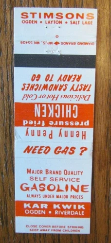 STIMSONS & KAR KWIK GAS STATIONS MATCHBOOK COVER: OGDEN LAYTON RIVERDALE UTAH -D
