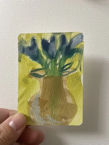 ACEO Original flower blue lily and vase Art on Card water colour painting OOAK