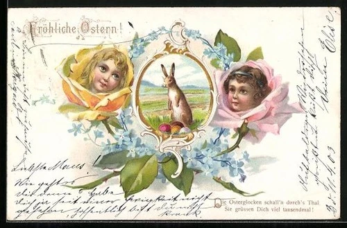 Lithograph Children's Heads in Rose Petals, Easter Bunny with Easter Eggs, Easter Greeting