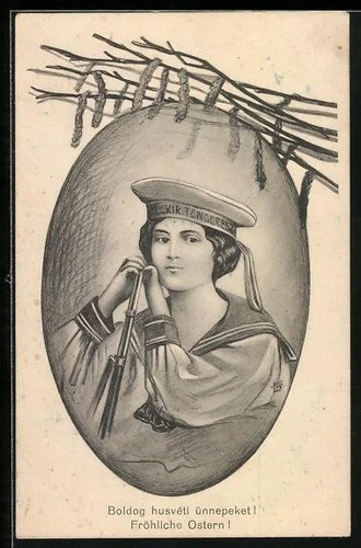 Artist postcard woman in sailor uniform of Kir. Tengeresz, Happy Easter