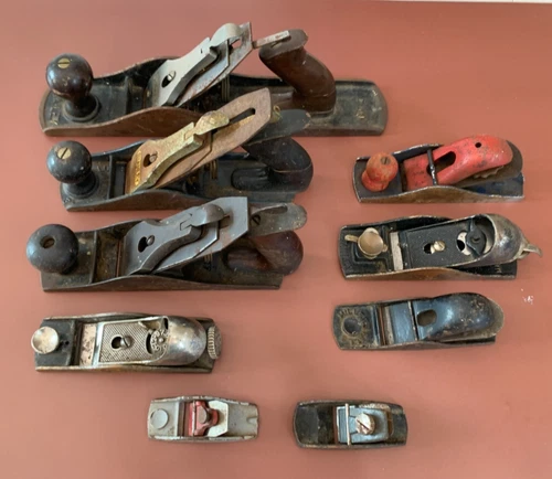 SET of 9 Vintage Antique Wood Plane Planer Tools (Stanley Bailey and other)