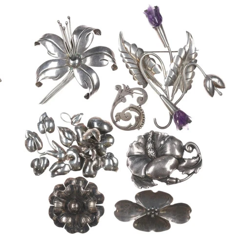 Large Mid Century Taxco Sterling and other flower pin collection