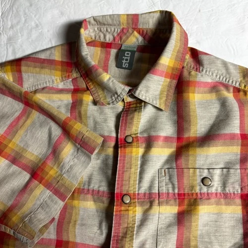 Stio Mens Plaid Short Sleeve Pearl Snap Shirt Red Yellow Grey Linen Blend Medium