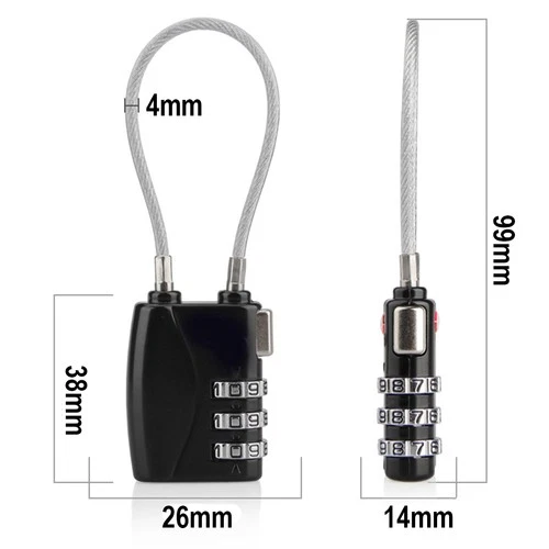 TSA 3 Digit Combination Lock Zinc Alloy Wire Rope Padlock for Travel