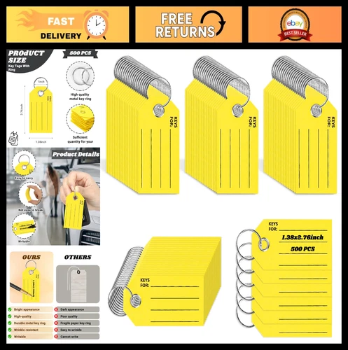 500 Pcs Yellow Key Tags with Labels & Rings - Car, Luggage, Dealer Identifiers