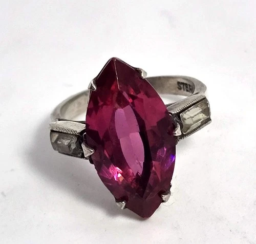 Art Deco Pink Paste marquis cut sterling silver vintage ring size 4.25